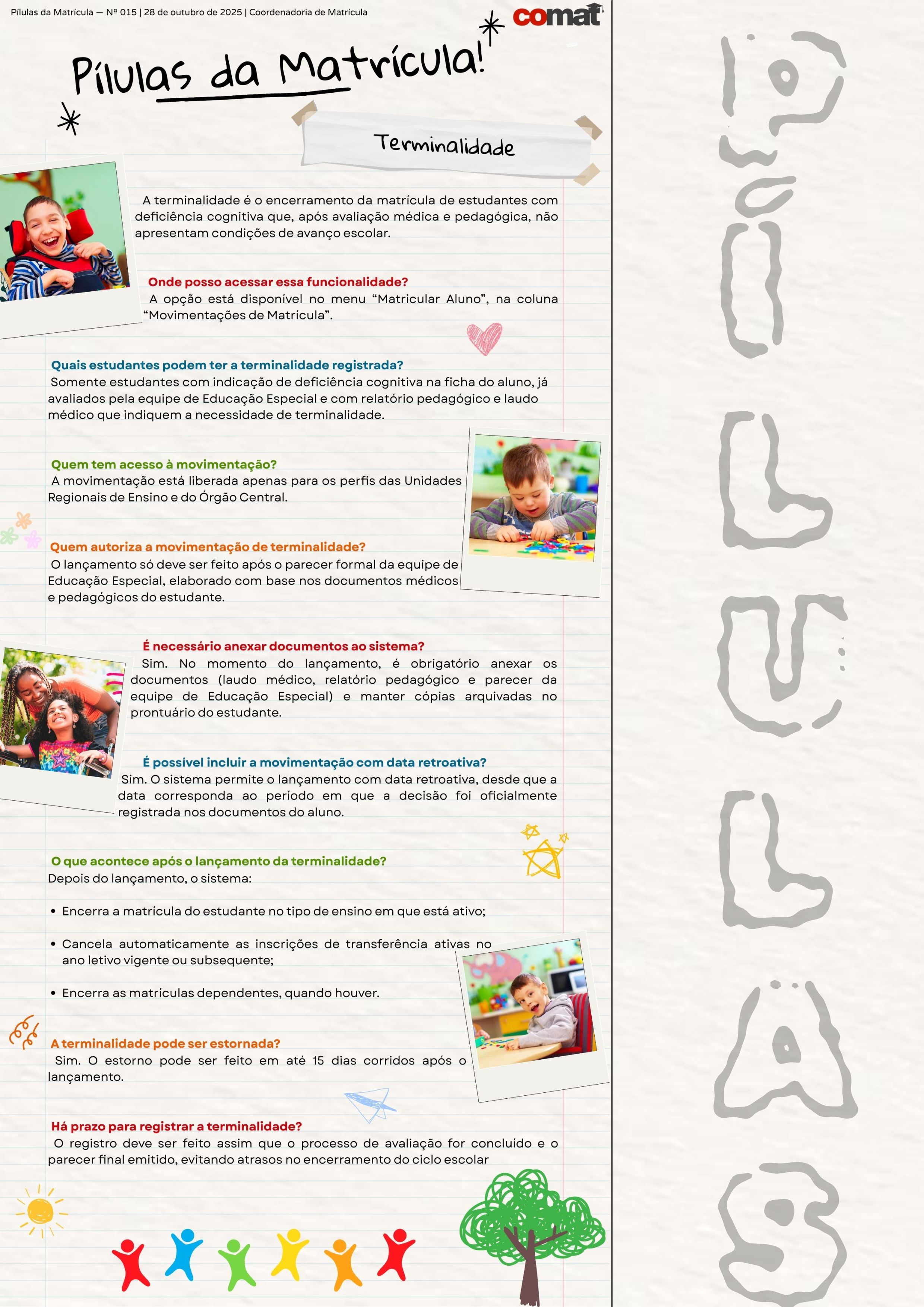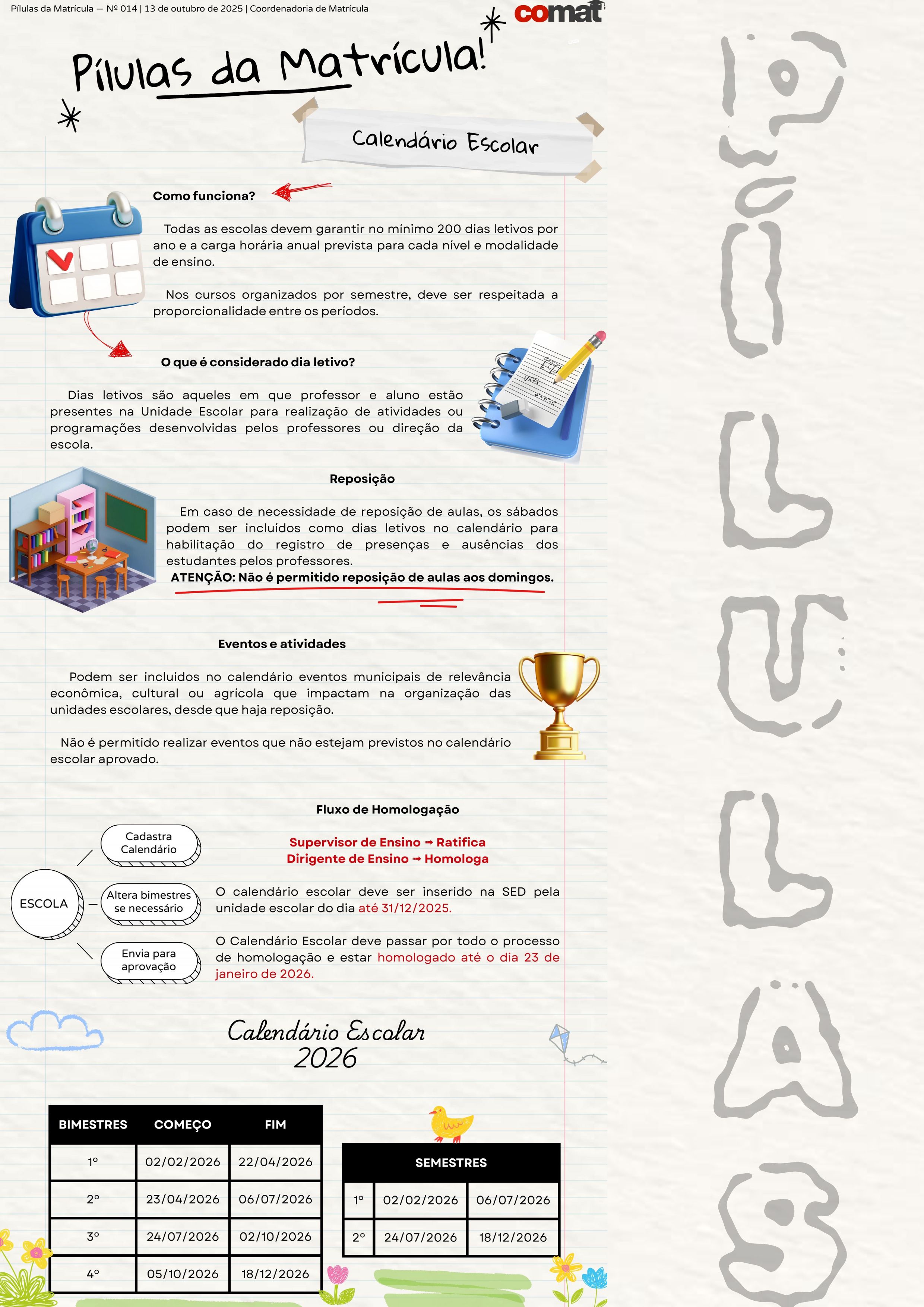 O Pílulas da Matrícula é um informativo semanal, no formato infográfico, cujo objetivo é oferecer orientações curtas e diretas sobre temas recorrentes do dia a dia.