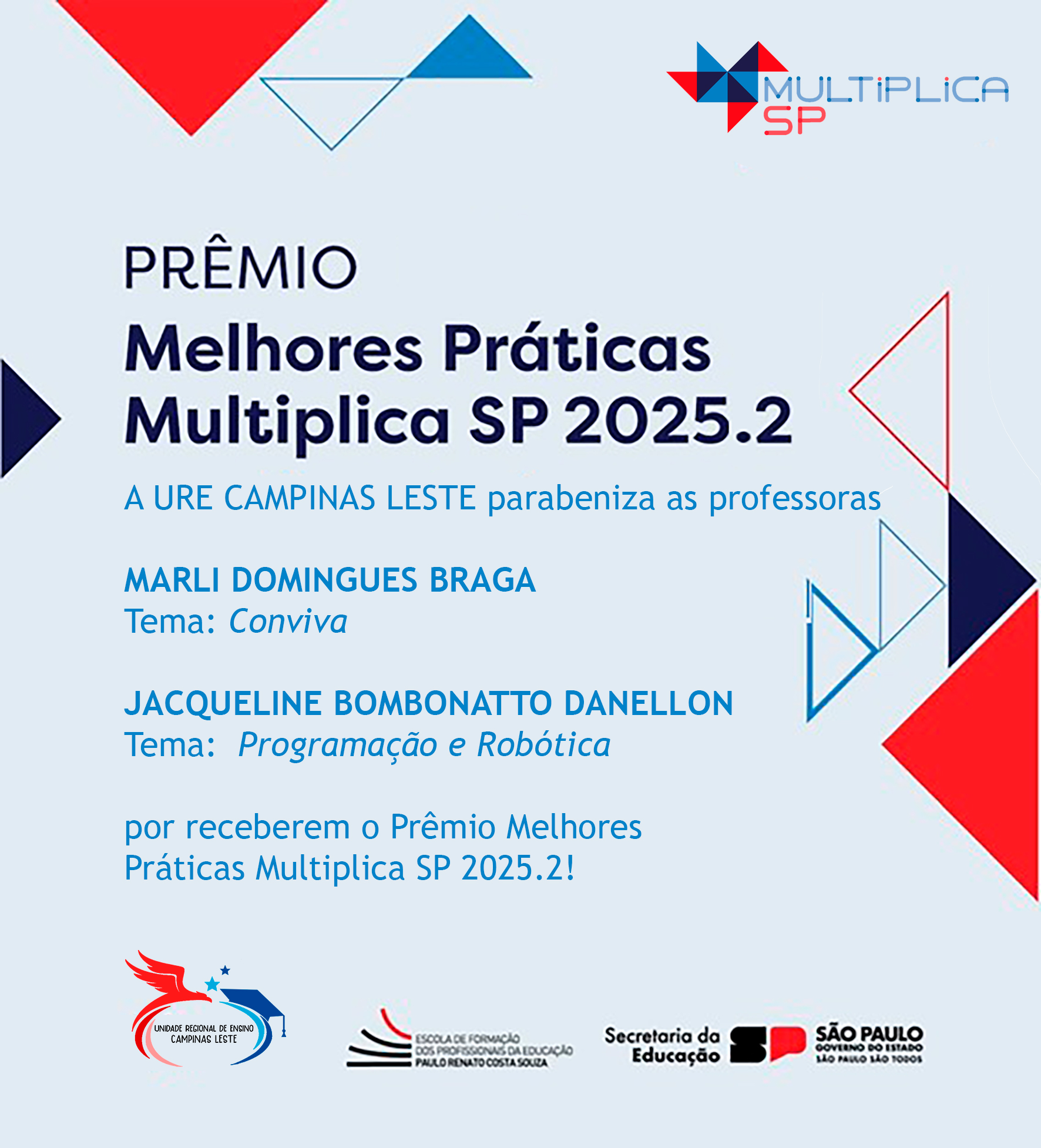PRÊMIO – Melhores Práticas Multiplica SP 2025.2! 11-12-2522 de dezembro de 2025 PRÊMIO – Melhores Práticas Multiplica SP 2025.2! Parabenizamos as professoras Marli Domingues Braga – Tema CONVIVA e Jacqueline Bombonatto Danelon – Tema Programação e Robótica por receberem o Prêmio Melhores Práticas Multiplica SP 2025.2